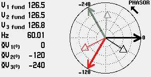 上圖中為應用實例量測的相量圖,其電壓相序接線錯誤,導致其功率潮流計量錯誤。