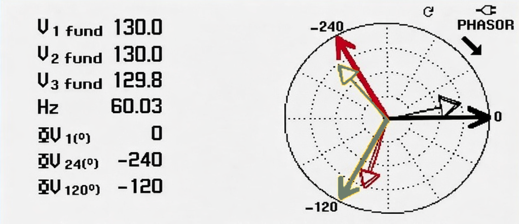 相序的正確性可透過儀器量測與相量分析進行快速判斷。最基本的方法是使用相序表或電力品質分析儀,量測三相電壓之相位關係,判斷其為正相序(R→S→T)或逆相序(R→T→S)。進一步而言,透過相量圖可同時觀察電壓與電流的相位關係,確認各相是否正確對應。